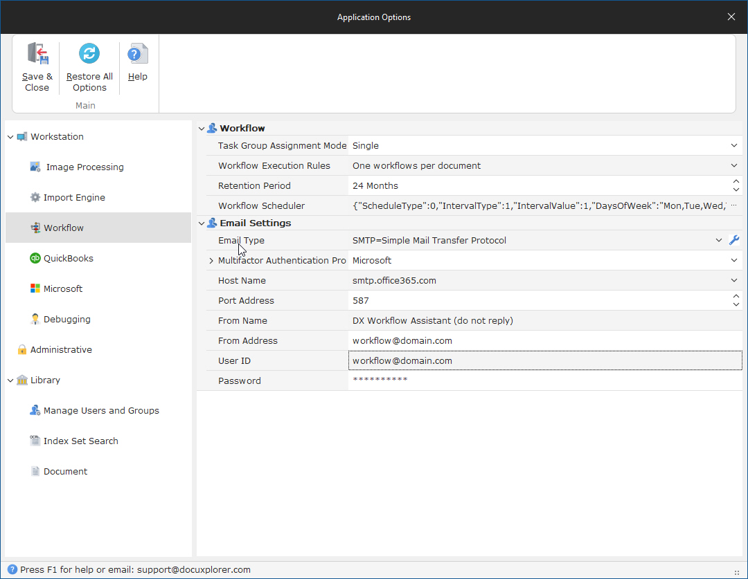 From the DocuXplorer Desktop Ribbon Tab select Home | Options | Workflow Settings